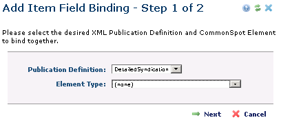 You are here: Administrators Reference > Site Administration > XML Publication > Item Field Bindings > Add Item Field Binding - Step 1 of 2