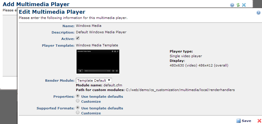 Render Module: Displays a dropdown for selecting a render handler for formatting multimedia. Accept the default, as shown above, or name another existing module. Custom render modules must reside in {site_root}\cs_customization\multimedia\{servicename}\renderhandlers. This directory is created when a channel is created. See Add Multimedia Channel.