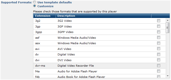 Use this dialog to configure YouTube, Brightcove, or other players for your multimedia content. You can accept the default template configuration or optionally customize player properties (such as height, width, and background) and allowable file formats.