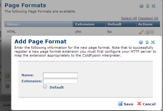 Use the Add Page Format dialog to record a new page output type/extension in the Page Formats dialog. This dialog displays in edit mode when you click the edit icon for an individual document format in the Page Formats dialog.