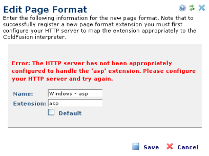 After adding or modifying a file type, CommonSpot tests whether the extension is mapped correctly by writing a test file to the /commonspot/ directory and browsing with an HTTP call. If you have not first configured your HTTP server to map the new extension appropriately to the ColdFusion or Railo Application Server, CommonSpot displays a message similar to the following: