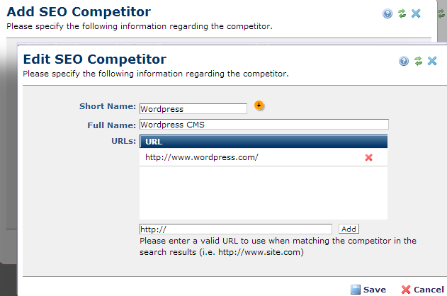 You are here: Administrators Reference > SEO Administration > SEO Administration Menus > Properties/Settings > Competitors > Add SEO Competitor
