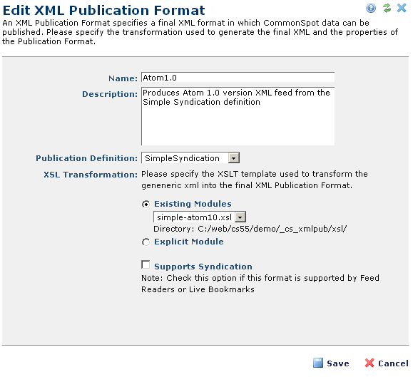 Access the Edit XML Publication Format dialog by clicking the edit icon for an existing format in the XML Publication Formats dialog. Edit Publication Formats displays the location of the XSL file that you need to update. In the example below, the file name is simple-atom10.xsl and its location is at C:/web/cs50/demo/_cs_xmlpub/xsl/.