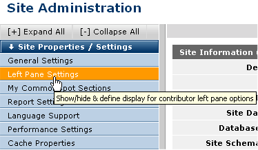 Authenticated administrators can further customize the workspace to show/hide add, delete, edit, and assign security to left-panel options through the CommonSpot Site Administration interface.