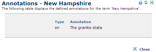 The Annotations dialog lists notes associated with an individual taxonomy term. Click the annotation icon next to a given term in the Browse Taxonomy dialog to view notes. The Annotations - term_name dialog displays, as shown below for the term New Hampshire, annotated with the state motto, The granite state.