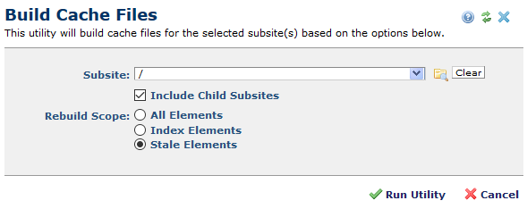 Access this dialog from Site Administration. Expand Utilities, click Site Tools and choose Build Cache Files.- Select from the dropdown, or click the subsite icon . Optionally check Include Child Subsites to build cache for the selected subsite and all the subsites it contains. Leave this unchecked to build cache for the selected subsite only.