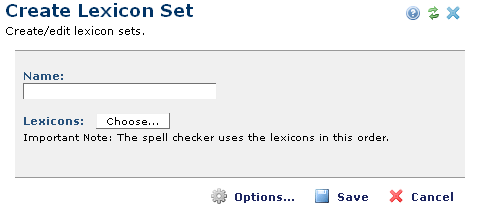 The Lexicon Set dialog is used to create and edit named sets of lexicon files. Access this dialog from the Manage Lexicon Set dialog, under the Spell Checking left panel in the Site Administration page.