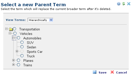 Select a new parent term for the orphaned narrower terms and click Save to recategorize them or Cancel to exit without saving.