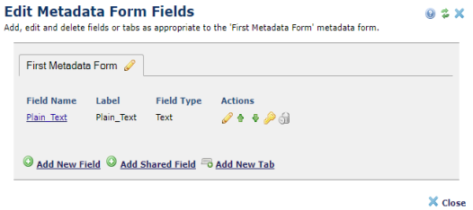 After adding all desired form fields, click Close. The Edit Metadata Form dialog closes and the Metadata Forms dialog redisplays showing the new form.