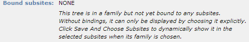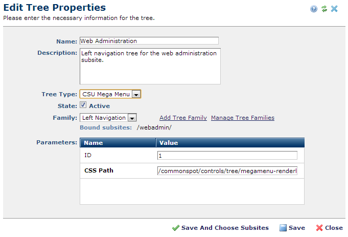 Access this dialog by clicking the properties icon in Manage Trees or Edit Tree to view or update name, state, and descriptive information for individual trees and to view or change subsite bindings.
