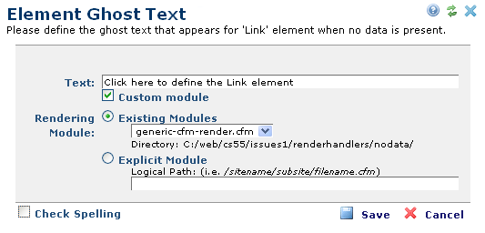 Choose a predefined module from the standard CommonSpot directory, or specify a path name. Where no options are available in the standard directory CommonSpot displays (none available). Use Rendering Modules for more efficient template creation or to include non-text elements, such as horizontal rules, in ghost text.