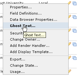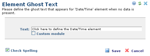 For defined Elements that contain no data, you can optionally specify ghost text that displays as a placeholder for contributors at your site. Access the Element Ghost Text dialog from the Manage Elements dialog by clicking the edit icon for a standard or custom Element and selecting the Ghost Text option.