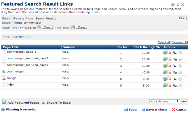 This dialog displays when you click a search term Featured Link in Manage Featured Search Results to view pages categorized as "Featured" in the named search results page. You can bind additional pages to the selected search term by choosing Add Featured Pages.