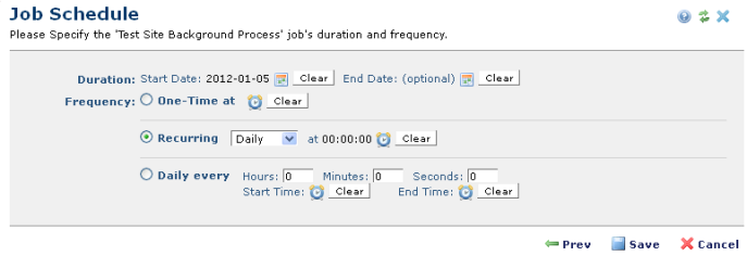 in Site Scheduled Jobs , Server Scheduled Jobs , or Customer Scheduled Jobs to set start and end times and frequency for individual jobs. Modify these settings according to specific job requirements. For example, to find the best balance between content freshness and the performance benefits of serving "stale cache" you might run a background cache regeneration job on a recurring basis during low-traffic periods.