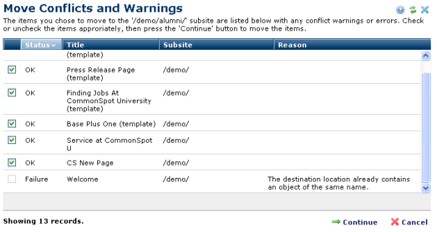 CommonSpot displays a Conflicts and Warnings dialog for actions that may produce undesired results, as shown for the Welcome page item below. This dialog displays the page or file name of the object you are moving and the destination subsite in the Subsite column.