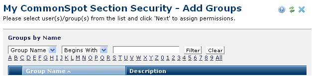 Click Add Group(s) in the Left Pane Security dialog to set security for individual My CommonSpot panels.