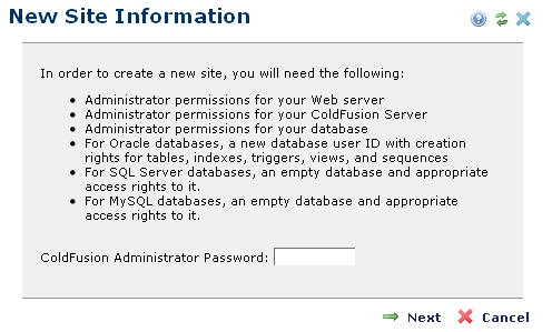New Site Information prompts for the ColdFusion Administrator password.