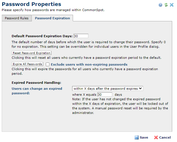 Default Password Expiration Days: The default number of days before which the user is required to change their password. Specify 0 for no expiration. This setting can be overridden for individual users in the User Profile dialog.