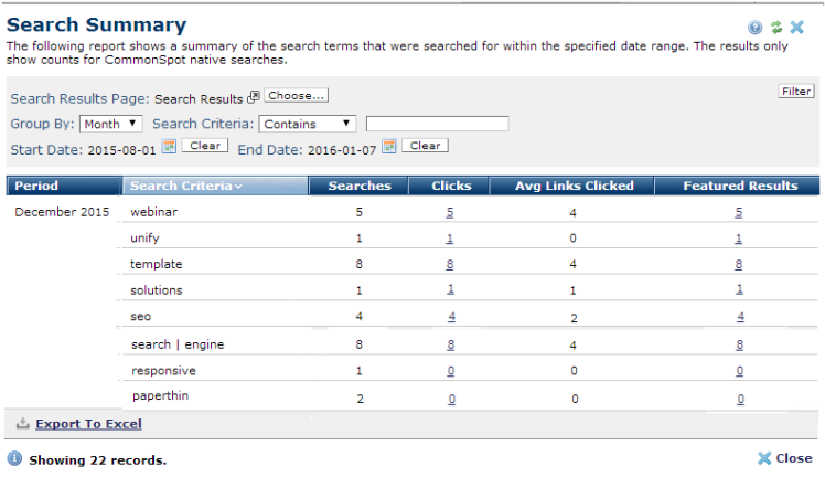 Click the Filter button to apply your criteria and review the report. CommonSpot returns results within the period specified, as controlled by the period defined for maintaining search history.