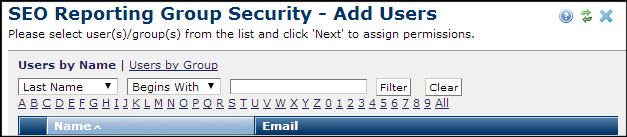 This dialog displays when you click Add User in the SEO Reporting Group Security dialog to grant new users access to the specific keyword reporting groups.