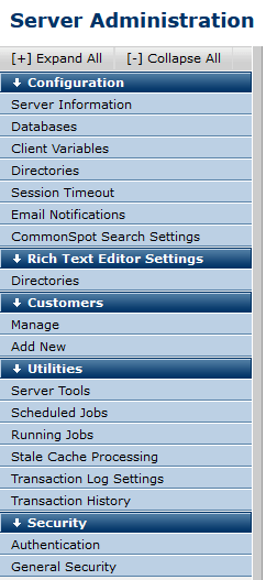 Use the following options to set up and maintain CommonSpot Server: