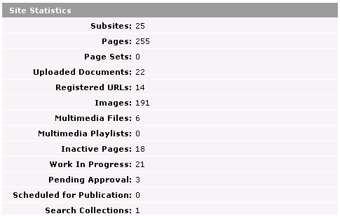 This section of the Site Administration Dashboard collects the following statistics for the current site.