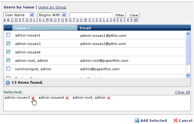 Click checkboxes to select users. Choices display in the Selected box. Click
