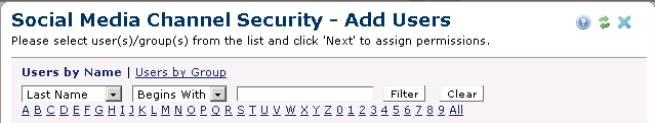 Use this dialog to grant individual users rights to Social Media Channels. Access this dialog by clicking Add User(s) in Social Media Channel Security.