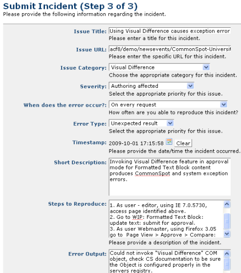 You are here: Administrators Reference > Site Administration > Integrated Support > Submit Incident Step 3 of 3