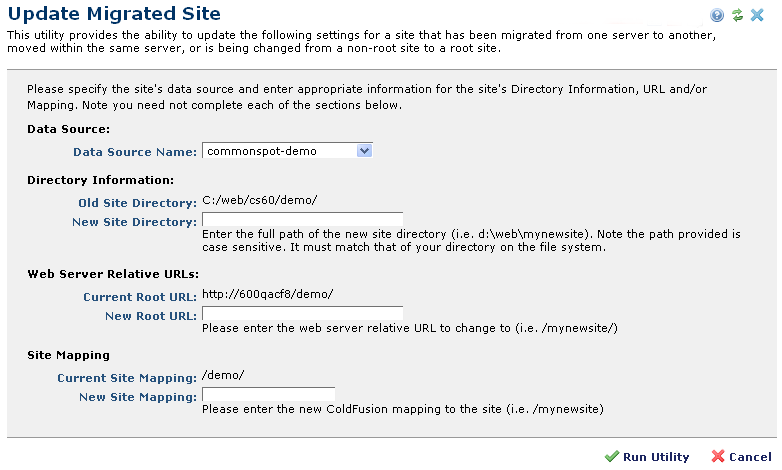 Access this dialog by choosing Admin - Server Administration - Utilities - Server Tools and clicking Update Migrated Site. Use this utility to update mappings for migrated sites for events requiring configuration data changes, as described in the dialog. For example, you might use this utility to rename directories when moving CommonSpot to a machine whose drive letter or directory structure differs from the source machine.