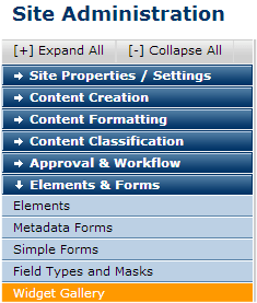 You are here: Administrators Reference > Site Administration > Elements & Forms > Widget Gallery