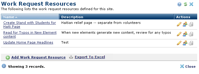 Use the Work Request Resources dialog to review, create, modify, and delete commonly requested tasks for your site and to specify or change which individuals or groups are responsible for addressing them. For example, assign requests for graphics to the Design group, network troubleshooting or site unavailable conditions to IT. The tasks and assignments you create here are available to content contributors to help automate site updates and changes.