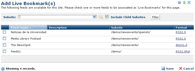 Select the feed or feeds you want to make available as Live Bookmarks on this page and click Save, or Cancelto exit without changing.
