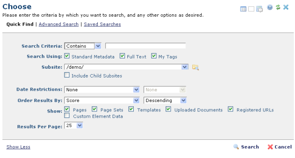 Search Using - These options vary according to the content type targeted by the current Choose or Find operation. Select all for the broadest search, or filter using Metadata (Properties), your full-text search criteria, or your personal tags.