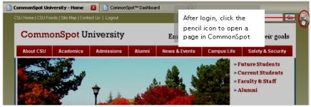 After authentication, click the edit icon entrance tab in the upper right corner of a CommonSpot page, as shown above.