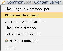 With the proper permissions, select Work on this Page to display the CommonSpot menu bars and left panel, as shown below.
