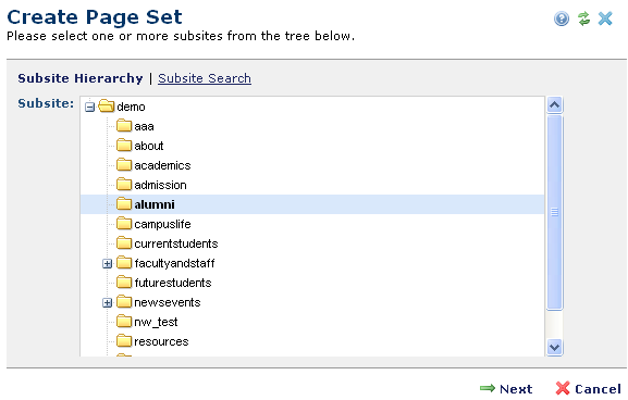 From the New menu in author mode, select Page Set. Select a Subsite location, then click Next to provide information for the set in the Create New Page Set dialog.