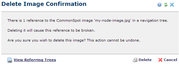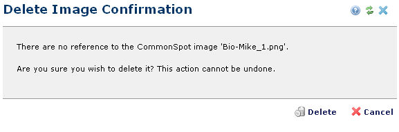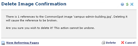 Use this dialog to review status for images you have selected for deletion. CommonSpot displays similar dialogs for pages, uploaded files, and URLs. For deleting a single image, with no active dependencies, CommonSpot displays the following message type.