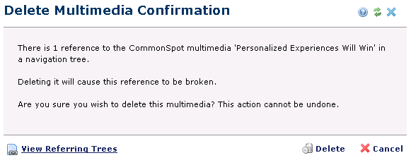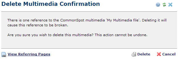 Use this dialog to review the status of multimedia files you are deleting. You can delete multimedia from My Multimedia Files and other reports. CommonSpot displays similar dialogs for pages, images, uploaded files, and URLs.