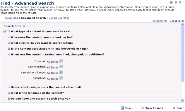 Use the Expired option to define criteria for viewing expired pages.