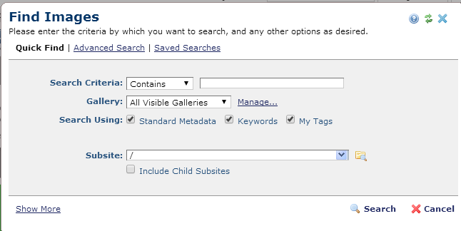 Click Tools - Find Images to locate images available at your site. The Find Images dialog displays Quick Find options. Use dropdown options to refine your search by Subsite, Category, and Owner information. Optionally, use the Search Type field to include Keywords and Tags or Common Fields in your search.