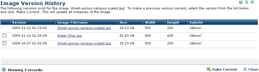 Clicking a link displays a preview of that version. It also selects this version, placing a green check next to the image name. Optionally select a previous version and click Make Current. Rolling back an image version updates all references to display the version you select.
