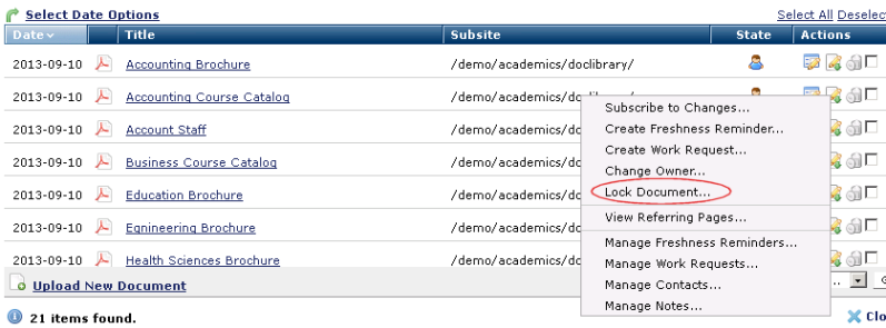 CommonSpot allows any contributor with author rights to an uploaded document to explicitly lock it to prevent others from making changes.