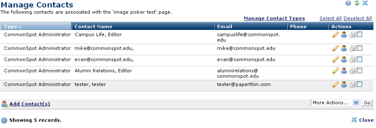 for individual items in My Content or other CommonSpot reports for most CommonSpot objects (pages, templates, multimedia files or playlists, uploaded documents, etc.). Use this dialog to view, manage, or associate new contacts with CommonSpot pages or files. Click to sort contacts by type, name, email, or phone.