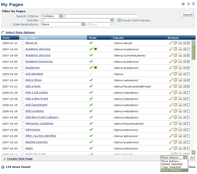 To move multiple pages at once, select  My Pages from the My Content Menu. Then click on the checkbox next to the name of the page(s) that you wish to move and select Move Selected from the More Actions dropdown.