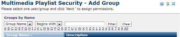 You are here: Contributors Reference > CommonSpot Menus > My Content > My Multimedia Playlists > Multimedia Playlist Security Add Group