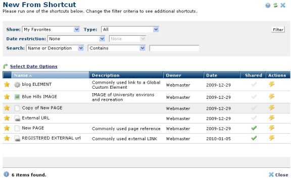Select New - From Shortcut to access your existing shortcuts. These shortcuts save time when you are creating new pages, images, registered URLs, or uploaded documents. Click the run