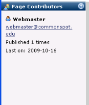 Use this pane to see who has worked on the current page. If enabled, displays contributors’ email addresses. Use this as a convenient way to contact contributors for specific pages and specific page changes. Click to email.