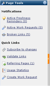 This panel provides summary notifications (including counts) and interactivity options. Use this pane to quickly view and respond to freshness reminders, work requests, and broken links for the current page. Click a link to view options.