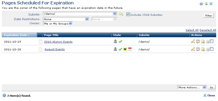 The Expiration Date column indicates the date specified for expiration in the Create New Page dialog (or modified through the Standard Properties dialog). This date is filtered by the values set in Date Restrictions.